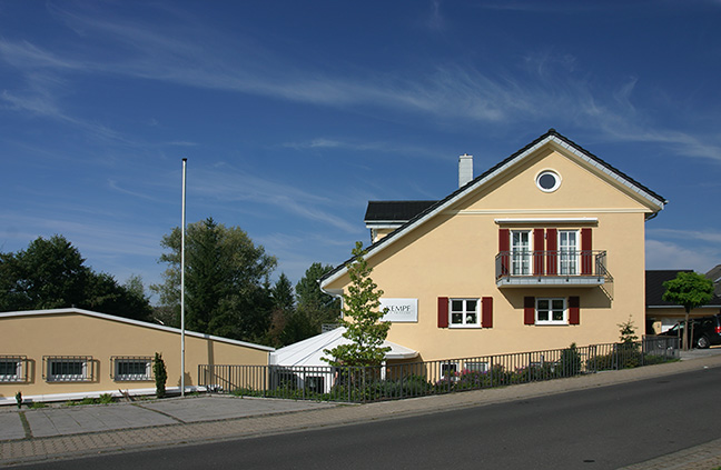 - Firmenlogo ohne sichtbare Befestigung mit einzeln auf ein Aluminiumblech (Farbton silber eloxiert) aufgeklebten Buchstaben aus Edelstahl.